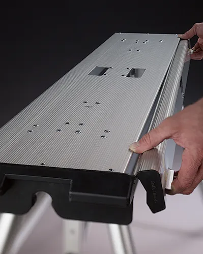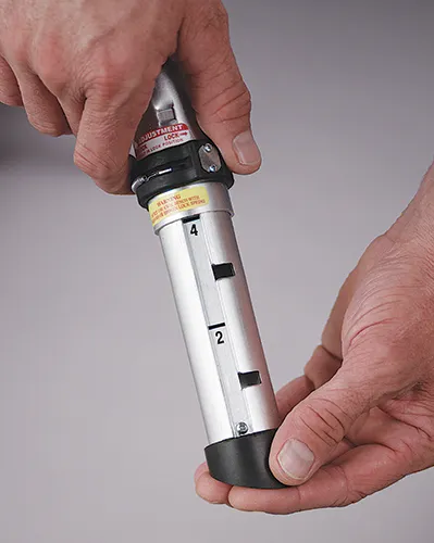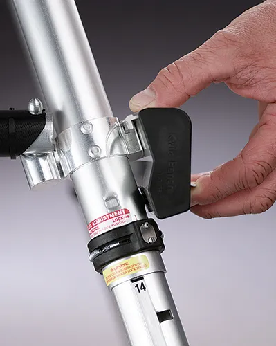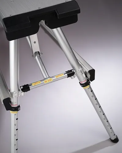 Legs are rapidly adjusted with a unique twist lock pin system which allows individual legs to be unlocked and adjusted with a simple twist of the wrist. Adjustments are from 18" to 30" in 2" intervals. Rubber end bumper protects woodwork and walls. Bumper also serves as guard and latch means for brace strut.
